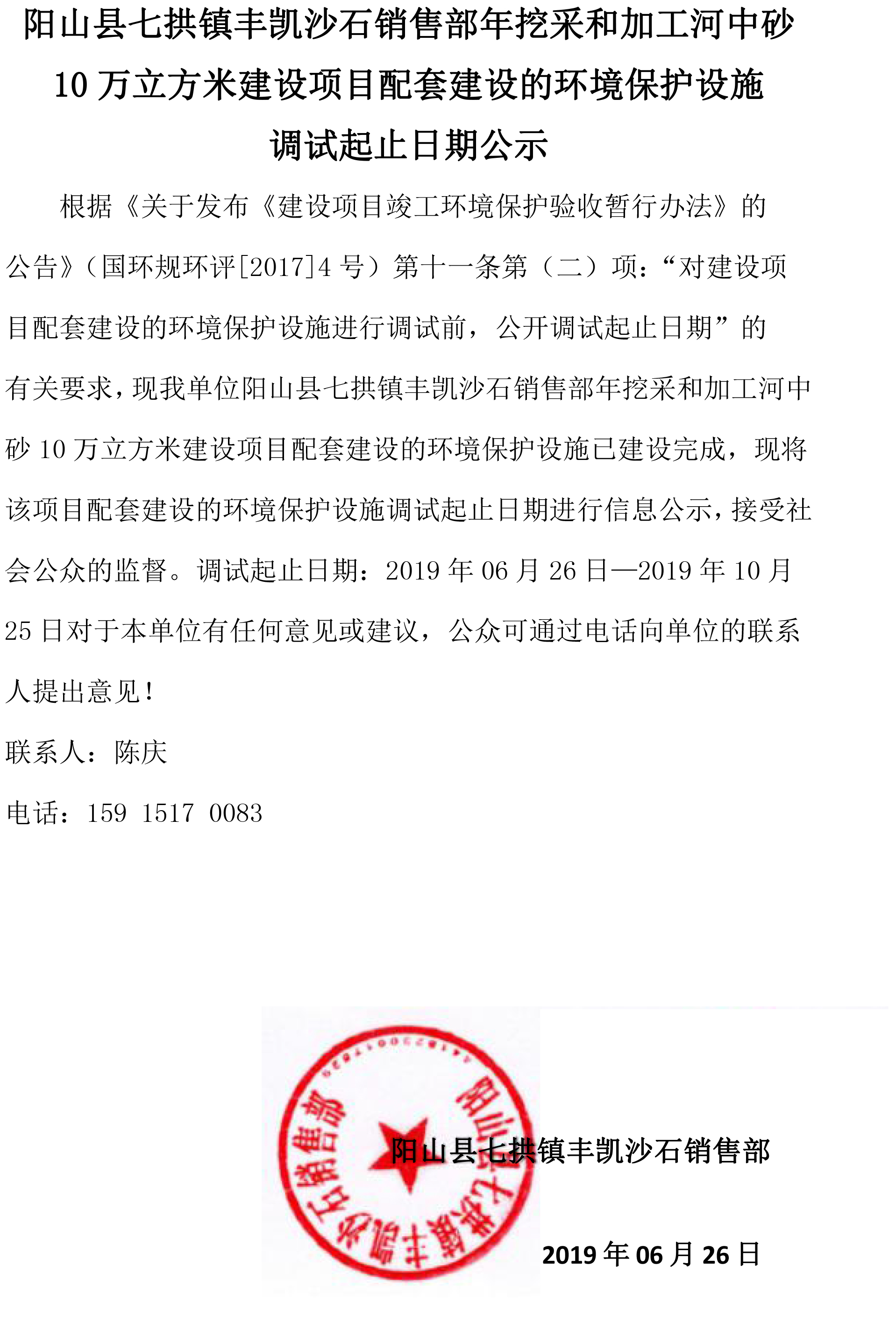 陽山縣七拱鎮(zhèn)豐凱沙石銷售部年挖采和加工河中砂10萬立方米建設(shè)項目配套建設(shè)的環(huán)境保護設(shè)施 調(diào)試起止日期公示