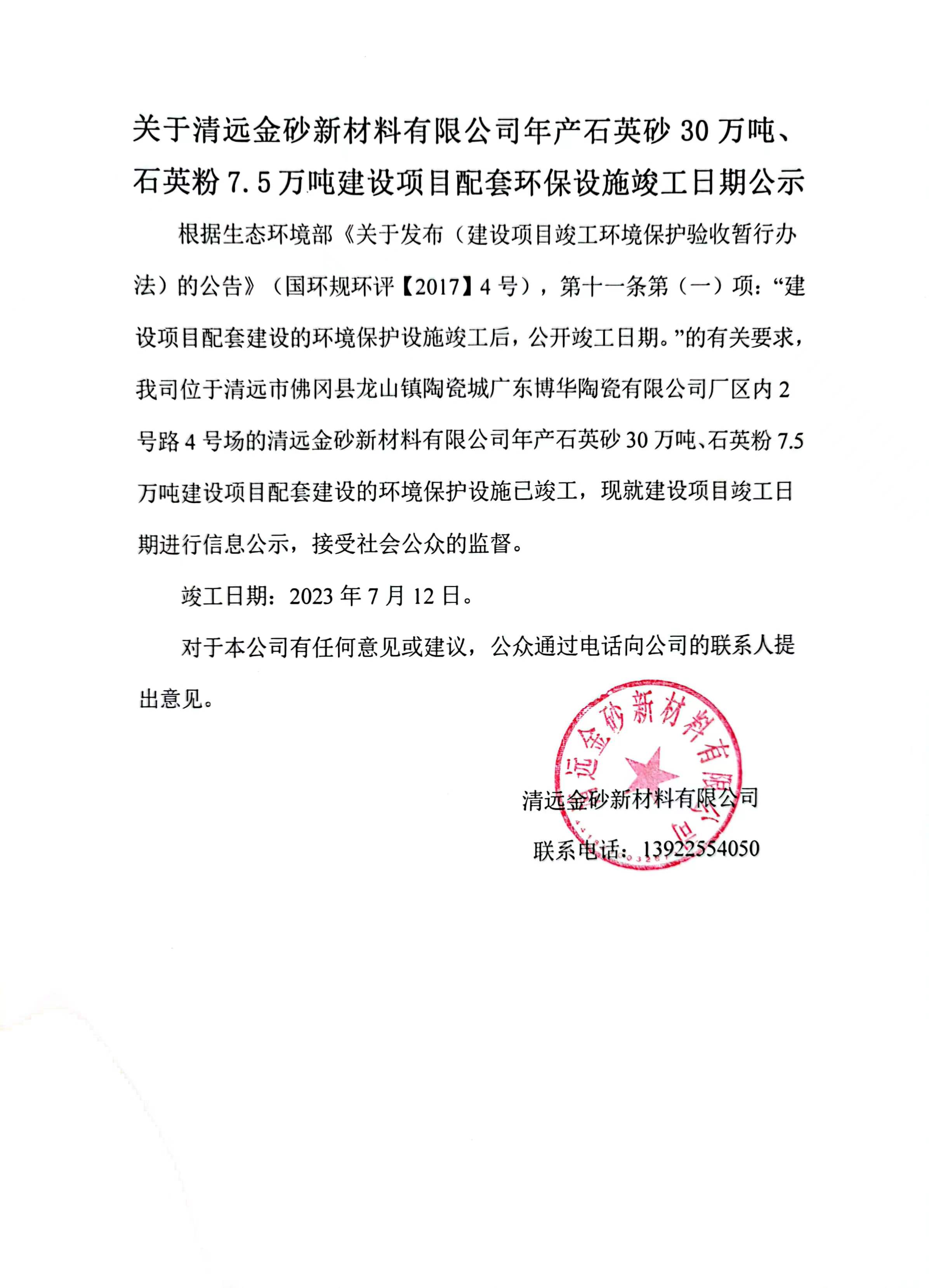 關于清遠金砂新材料有限公司年產(chǎn)石英砂30萬噸、石英粉7.5萬噸建設項目配套環(huán)保設施竣工日期公示